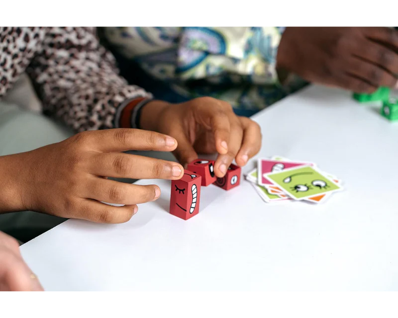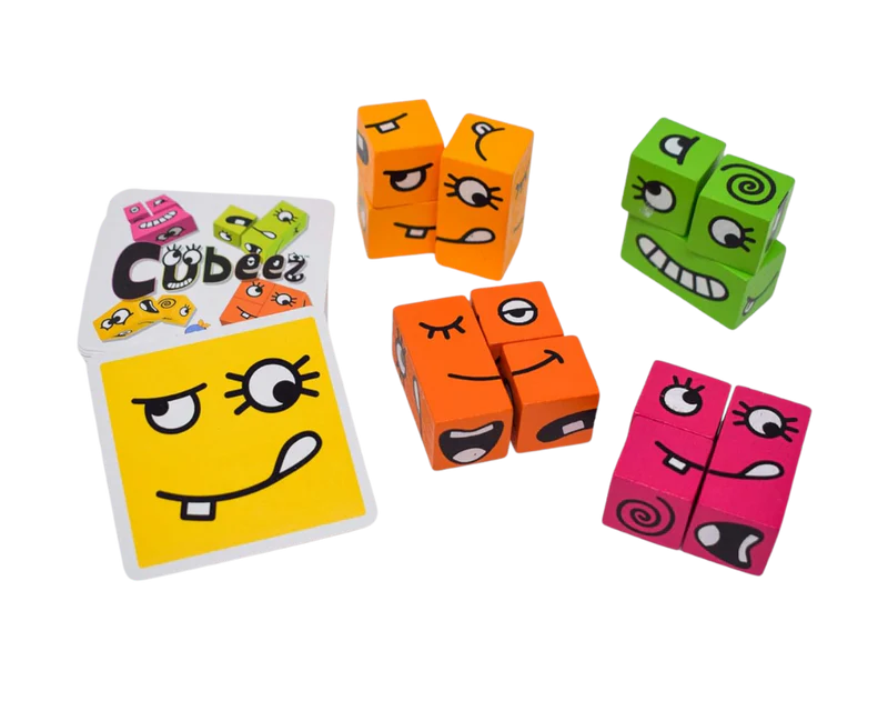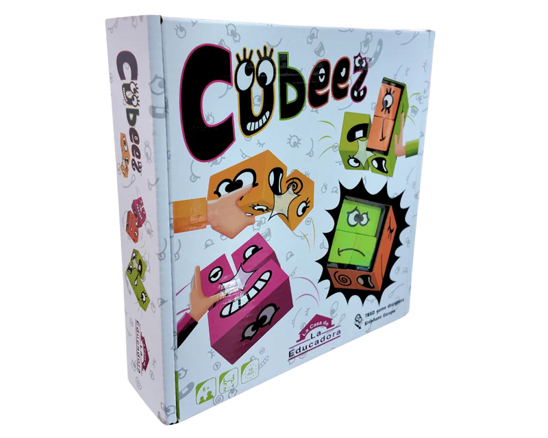 ¡Es hora de una carrera! ¿Puedes formar una cara más rápido que los demás en Cubeez? No en tu propia cara, claro; debes girar y voltear rápidamente tus tres cubos para que coincidan con la cara divertida que aparece en la carta de desafío.