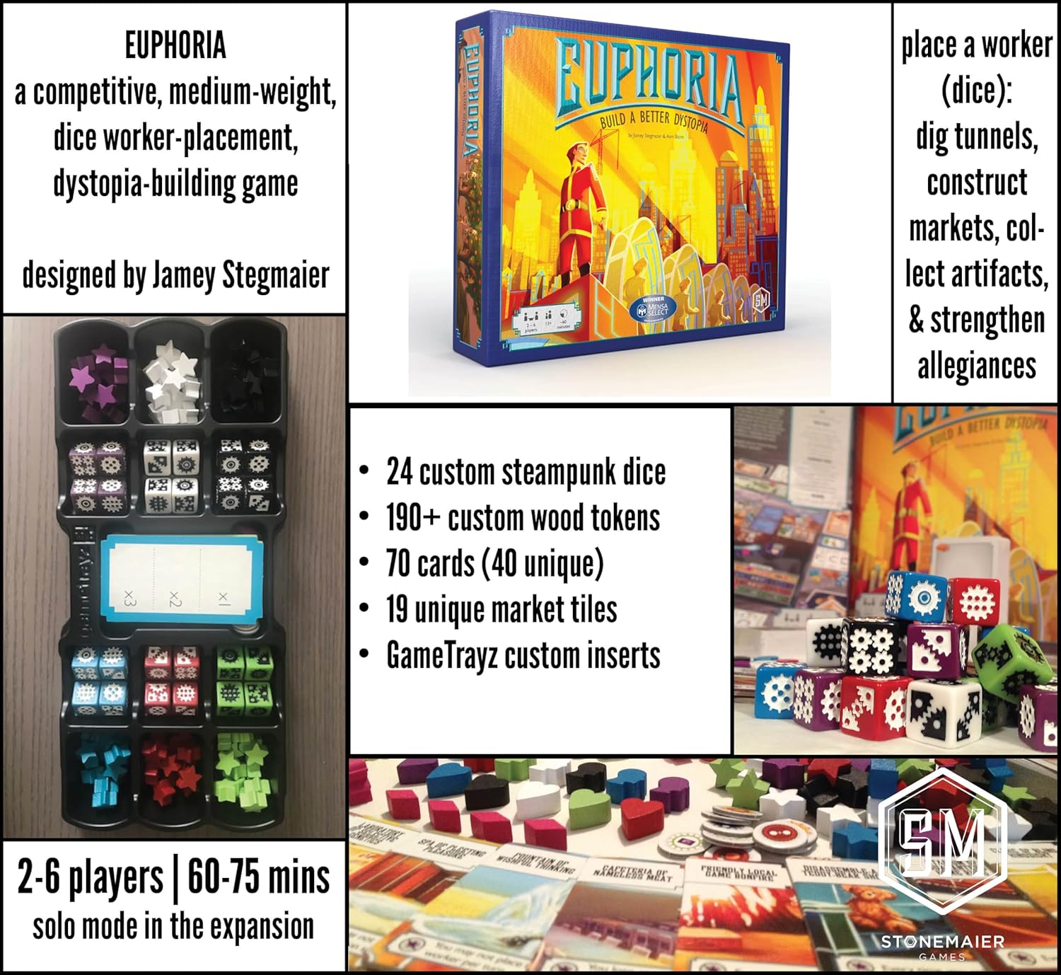 En Euphoria, lideras un equipo de trabajadores (dados) y reclutas (cartas) para reclamar el control de un mundo distópico. Generarás recursos, excavarás túneles para infiltrarte en áreas rivales, construirás mercados, recolectarás artefactos, fortalecerás alianzas y cumplirás agendas secretas.