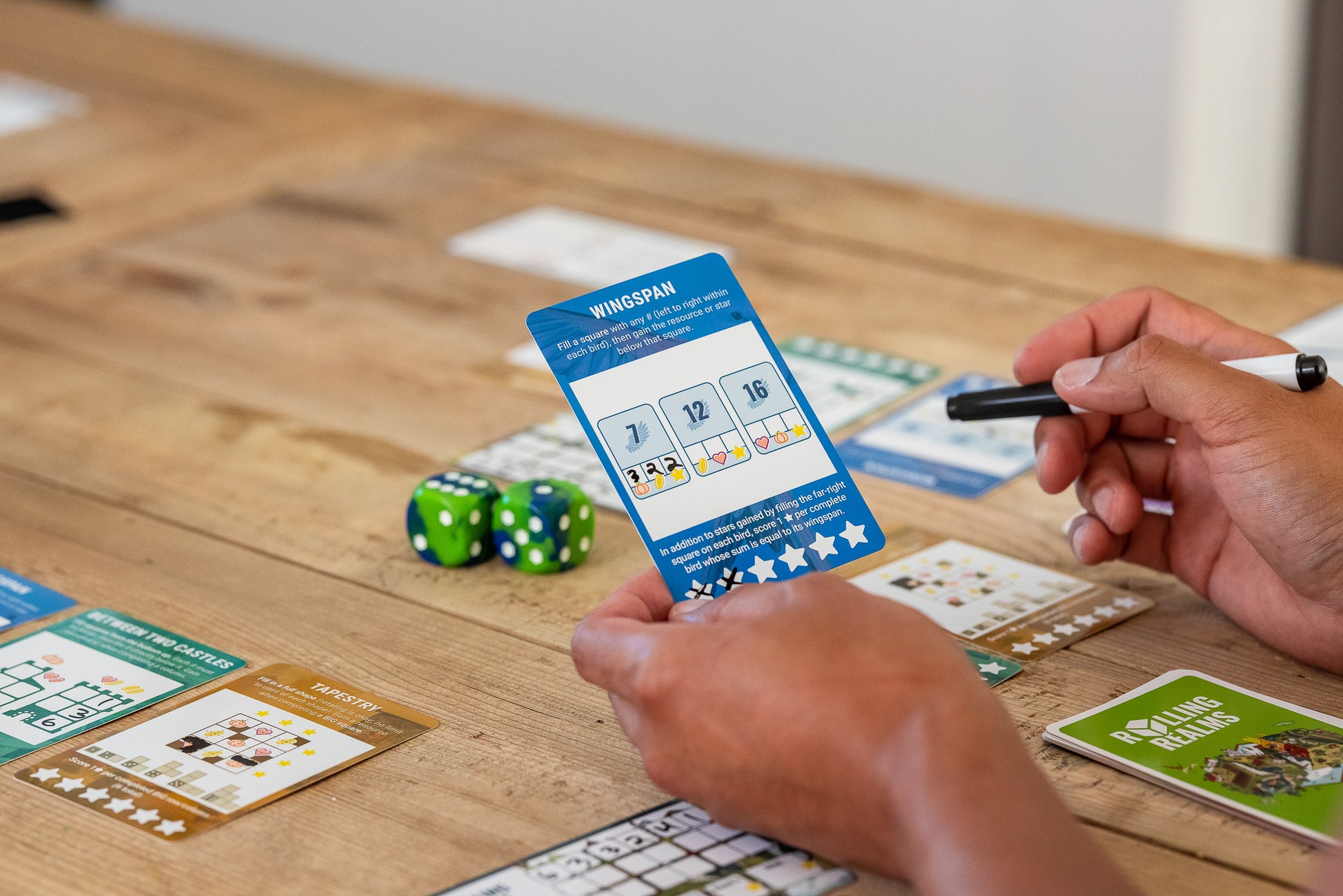 En Rolling Realms, los jugadores compiten por obtener la mayor cantidad de estrellas a lo largo de 3 rondas de minijuegos (el juego incluye 11 “reinos” distintos). Se trata de un roll-and-write, lo que significa que los jugadores escriben en los componentes del juego usando marcadores borrables.