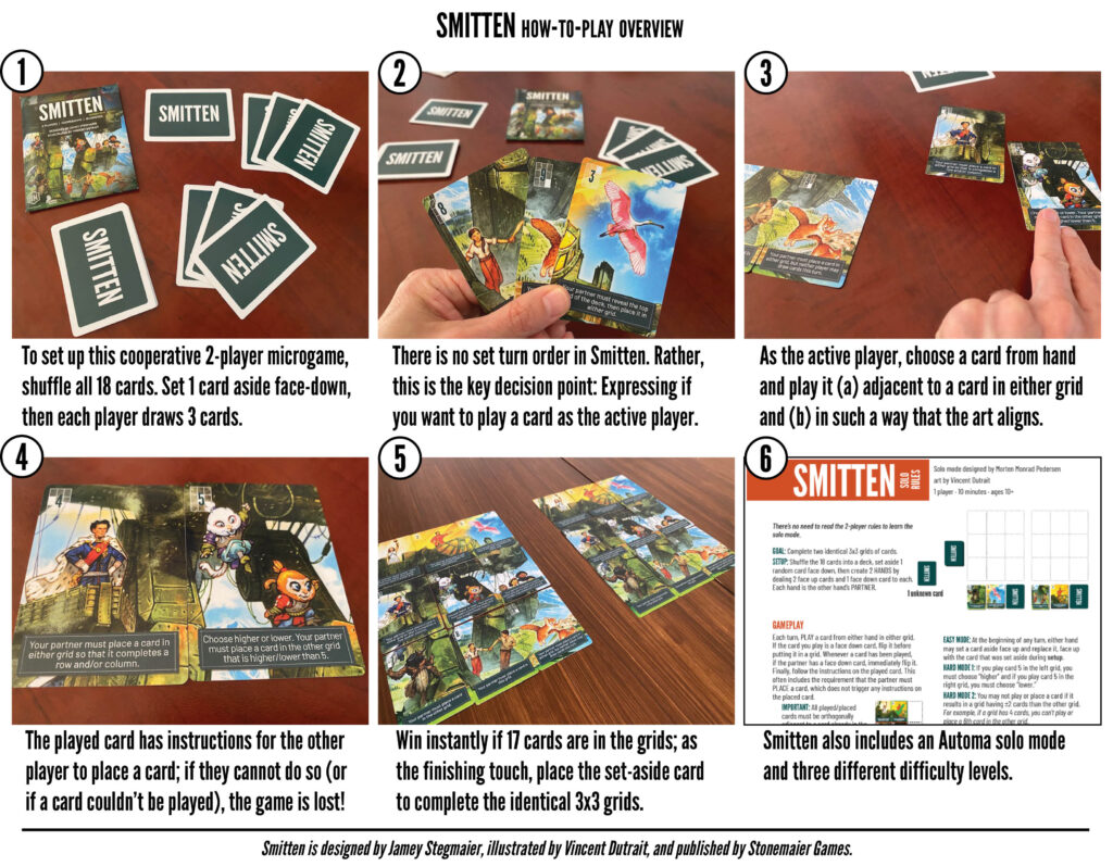 Smitten 2 es un microjuego cooperativo diseñado para 1–2 jugadores que reta a la coordinación, comunicación limitada y pensamiento táctico. Esta secuela independiente incluye 9 cartas nuevas creadas por Ryan S. Davis, con ilustraciones de The Mico inspiradas en distintos juegos de Stonemaier lanzados después del primer Smitten.