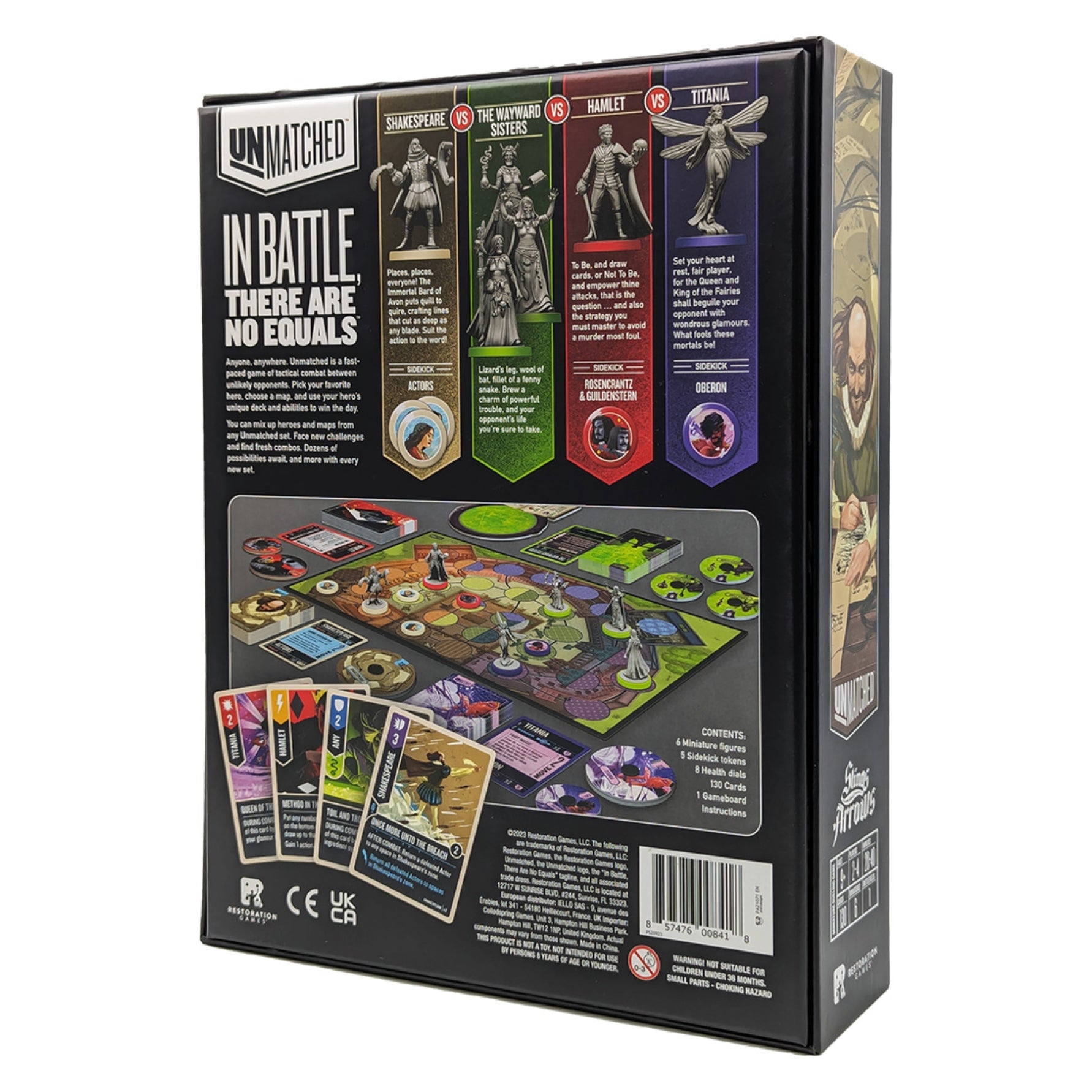 El drama se desarrolla en el campo de batalla del Teatro Globe, desde el backstage hasta el balcón. Como con todos los sets de Unmatched, estos héroes pueden enfrentarse a luchadores de otros sets —incluso contra los villanos de Unmatched Adventures—, convirtiéndolo en una incorporación imprescindible para jugadores experimentados o en un excelente punto de entrada para los nuevos.