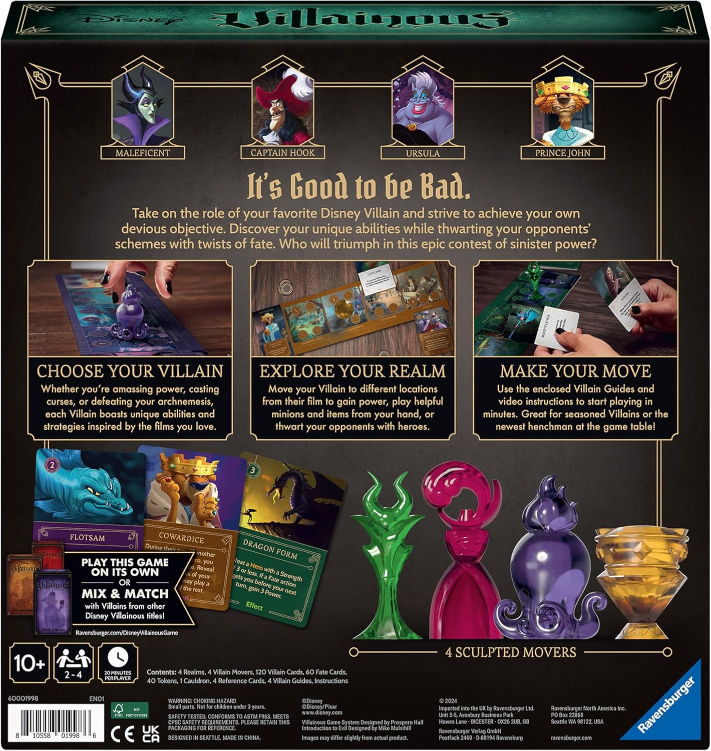 JUEGO INMERSIVO: Sumérgete en los siniestros objetivos de 6 villanos icónicos de Disney: Capitán Hook, Maléfica, Jafar, Úrsula, Reina de Corazones y Príncipe Juan. Interactúa con los queridos personajes de Disney mientras tejes tu estrategia - Perfecto para los amantes de Disney: con su juego atractivo y personajes clásicos, este juego atiende a entusiastas de Disney, jugadores de estrategia y familias, por lo que es un regalo ideal para cualquier ocasión - Fácil de aprender: guías detalladas para cada villano proporcionan instrucciones claras y consejos estratégicos, lo que hace que el juego sea fácil de aprender y dominar